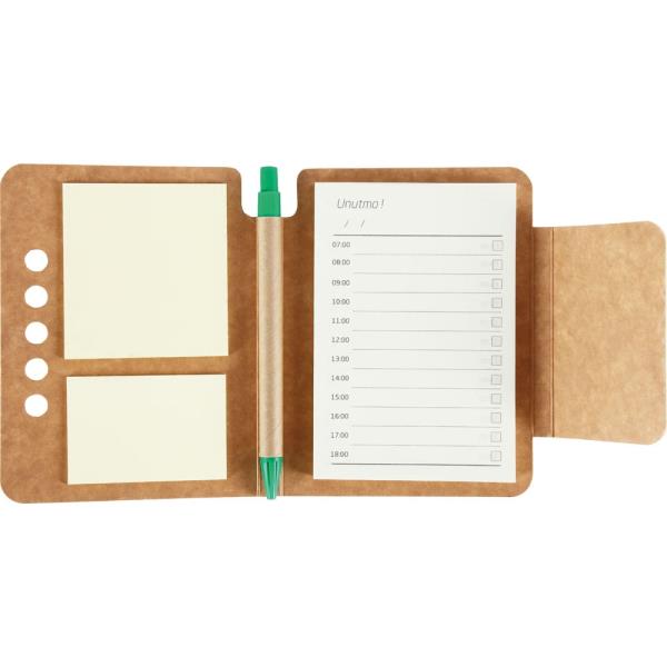 * Ebat: 10.7 x 14 cm * Baskı: UV, Serigrafi * Kalem Tutucu: Var * Kapak: Kraft * Yapışkanlı Notluk: Var * Kalem aksesuardır.