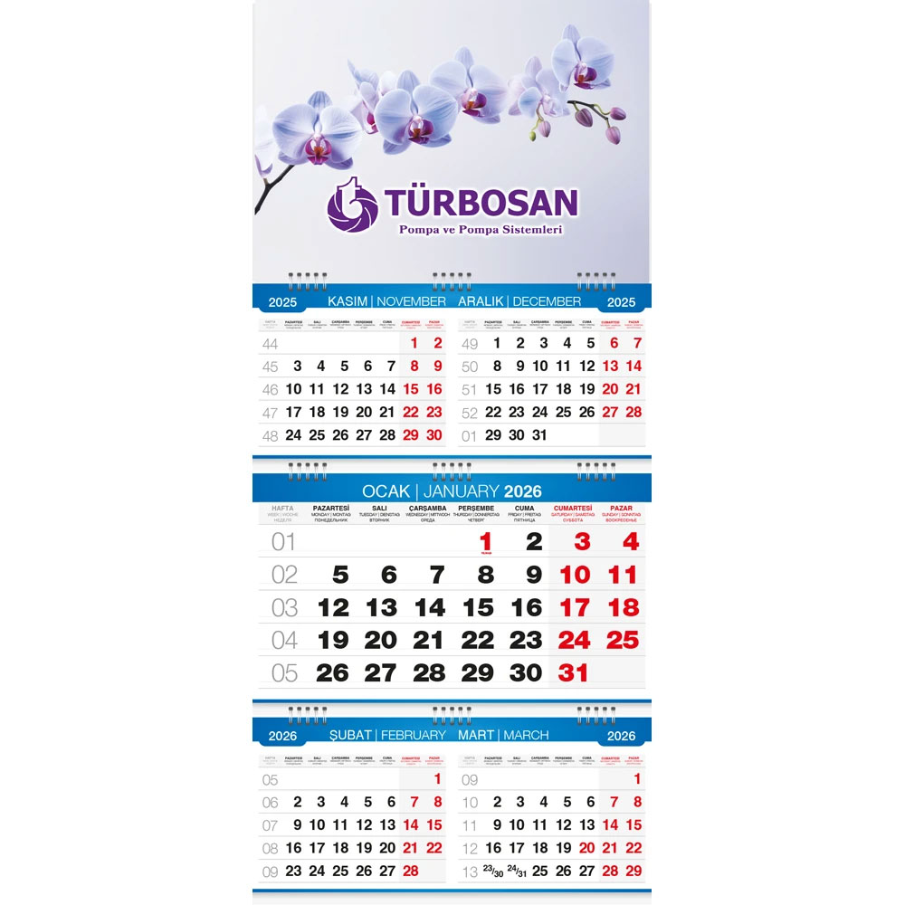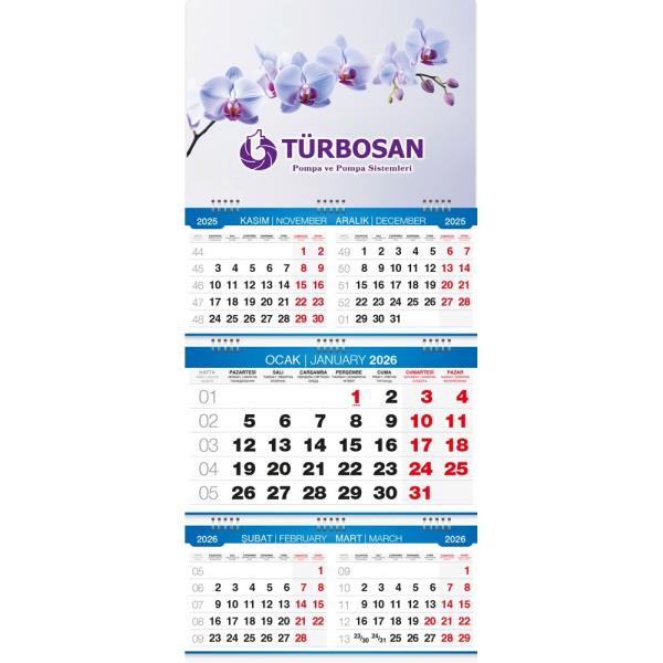 * Üç Parça Spiralli * Takvim Ebat: 33 x 73 cm * Ayna: 350gr. A.Bristol * Alt Karton: 350gr. A.Bristol * Reklam Alanı: 33 x 16,5 + 33 x 20,5 + 33 x 16,5 cm * Blok Ebat: 33 x 16 cm * Yaprak Kağıdı: 80gr. 1.Hamur
