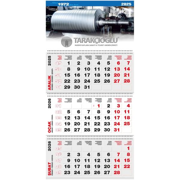 * Üç Parça Spiralli * Takvim Ebadı: 39,6 x 83 cm * Alt / Üst Karton: 2.2 mm Mukavvaya Taslama * Reklam Alanı: 23 x 39,6 cm * Blok Ebadı: 18 x 39,6 cm * Yaprak Kağıdı: 90 gr. 1. Hamur