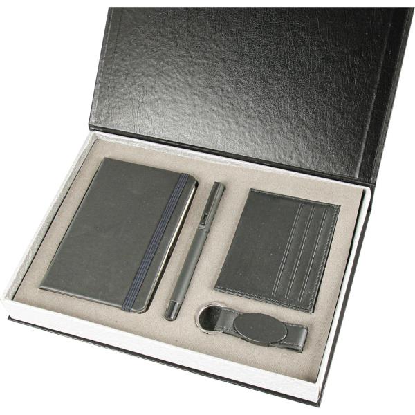 * Metal Kalem Roller (0555-490) * Termo Deri Defter 9,5 x 14 cm (İstiklal) * Deri Cüzdan Kartlık * Metal ve Deri Anahtarlık (AN-6230) * Kutu: Cilt Bezi